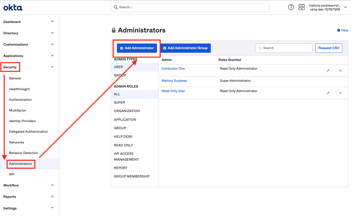 Select the administrator roles to grant: Read Only Admin, Super Administrator, or a combination of Read Only + Application Admin + Group Admin.