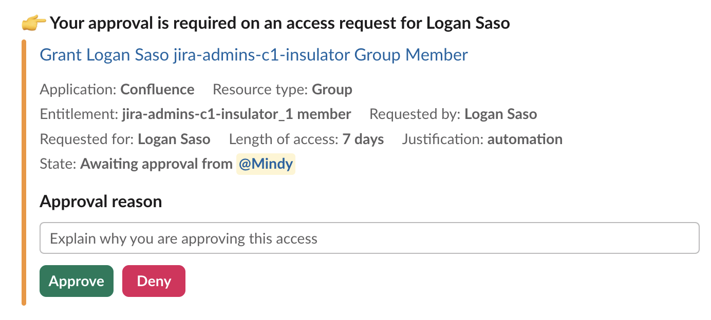 Get notified when your review is needed on a colleague’s access request, and approve or deny the request without leaving Slack: